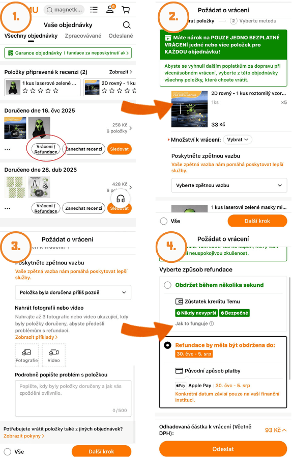Vrácení zboží bývá obvykle jednoduché. Provádí se přes aplikaci Temu a je nutné dodat fotky o stavu zboží, v jakém přišlo. Peníze se vrátí na účet obvykle do 7 až 14 dní.